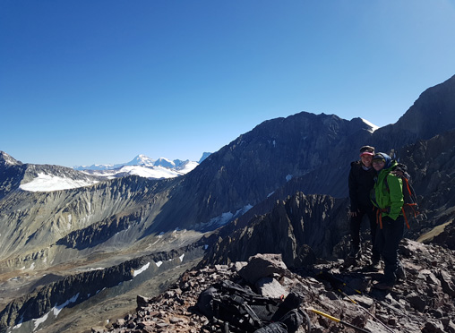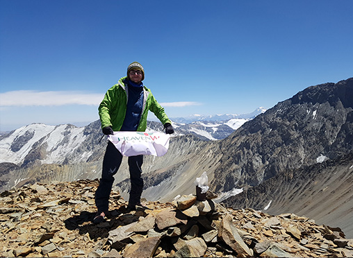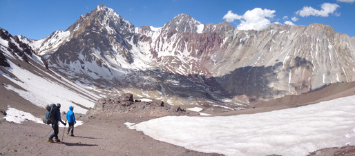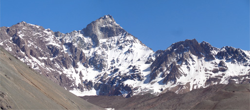 La Punta Santiago: Entre las varias cumbres subsidiarias que guarnecen el macizo del Plomo, destaca la Punta Santiago, un esbelto cono que remata el filo que desde el Leonera se extiende hacia el noreste. El cajón de Los Sulfatos la delimita por el Norte y el del río Molina por el Sur, mientras que hacia el levante conecta con el Parsifal y a occidente con la Punta Hermandad”. |